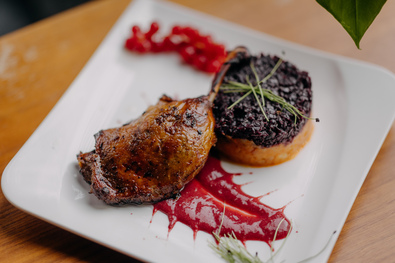 A konfitált kacsacombot a hagymás tört burgonyával és párolt vörös káposztával tálaljuk, mellé meggyszószt kínálunk. A tányért pirosribizli-gerezdekkel és mikrozöldekkel díszítjük.
