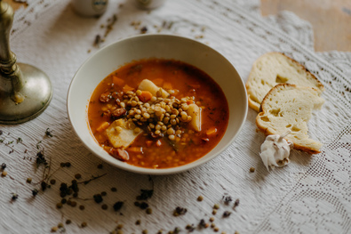 Hozzávalók: 50 dkg lencse, 1 fej hagyma, 2–3 sárgarépa, ½ közepes zeller, 25 dkg füstölt kolbász, 7 dl sűrű paradicsomlé, só, frissen őrölt bors és köménymag, majoránna, kakukkfű, rozmaring, illetve lestyán, ecetes tárkony, babérlevél, 2 cikk fokhagyma, 1–2 evőkanál olaj.