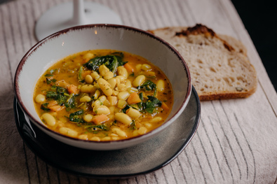 Ezalatt a vesebabkonzervet leszűrjük, a babszemeket szűrőben átmossuk, majd a megfőtt zöldségekhez adjuk, felöntjük a zöldségalaplével és felforraljuk. Ha már fő az étel, beletépkedjük a bébispenótot, ízesítjük balzsamecettel és megszórjuk finomra vágott petrezselyemzölddel. Forrón, friss kenyérrel tálaljuk. Tetszés szerint lehet gazdagítani csirkehússal, csicseriborsóval, gombával vagy krumplival.