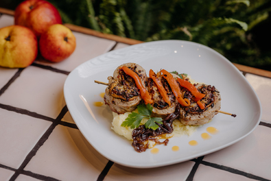 Hozzávalók: 1 bélszín, 1 evőkanál mustár, 1 kiskanál tört színes bors és 1 púpozott evőkanál zsír; a töltelékhez: 1 csapott evőkanál zsír, 20 dkg bacon vagy kolozsvári szalonna, 6–8 szál zöldhagyma, 1 kis csokor petrezselyemzöld, illetve 10–15 dkg félkemény sajt és 5 dkg parmezán; az omletthez: 2 tojás, 1 evőkanál olaj, só, bors, 1 kis csokor petrezselyemzöld. A vöröshagymalekvárhoz: 1 kg vöröshagyma, 3 evőkanál barna cukor, 0,5 dl olaj, 0,5 dl balzsamecet, ½ kiskanál rozmaring, ½ kiskanál kakukkfű, só, bors, pirospaprika.