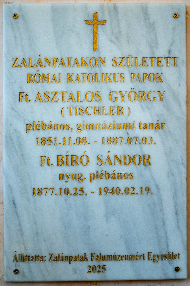 Vasárnap emléktáblát avattak Zalánpatakon a település két pap szülötte, ft. Asztalos (Tischler) György és ft. Bíró Sándor emlékére. A jeles alkalomra ft. Bíró Sándor nyugalmazott plébános születésének 148. évfordulója kapcsán került sor.