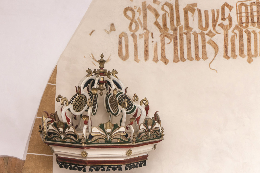 A déli oldalfalon a mellékhajótól nyugatra egy szürkével, feketével és fehérrel festett virágmotívum, valamint egy pirossal festett, ötszirmos, tulipánhoz hasonló virág alakja körvonalazódik. A déli karzat feljárójának egyik deszkáján átfestett felirat látható: „ÚJÍTtATOTt ANNO 1821-BEN.” Alatta egy korábbi festés időpontját megörökítő évszám sötétkékkel festve „17(75?)”.