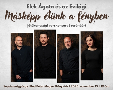 SEPSISZENTGYÖRGY. November 13-án, csütörtökön 19 órától kerül sor a Bod Péter Megyei Könyvtárban a Másképp élünk a fényben című jótékonysági verskoncertre Elek Ágota és az Evilági előadásában, Andrássy Réka, Balla Zsófia, Farkas-Wellmann Éva, Kiss Judit Ágnes, László Noémi, Nagyálmos Ildikó, Nemes Nagy Ágnes és Szabó T. Anna verseiből. Az előadás 14 éven felülieknek ajánlott. Ez alkalommal a 23 éves sepsiszentgyörgyi Loghin Szeréna Zsanett gyógykezelésére gyűjtenek adományokat, aki többszöri agyműtét után egy proton-/ionterápia kezelésre vár.