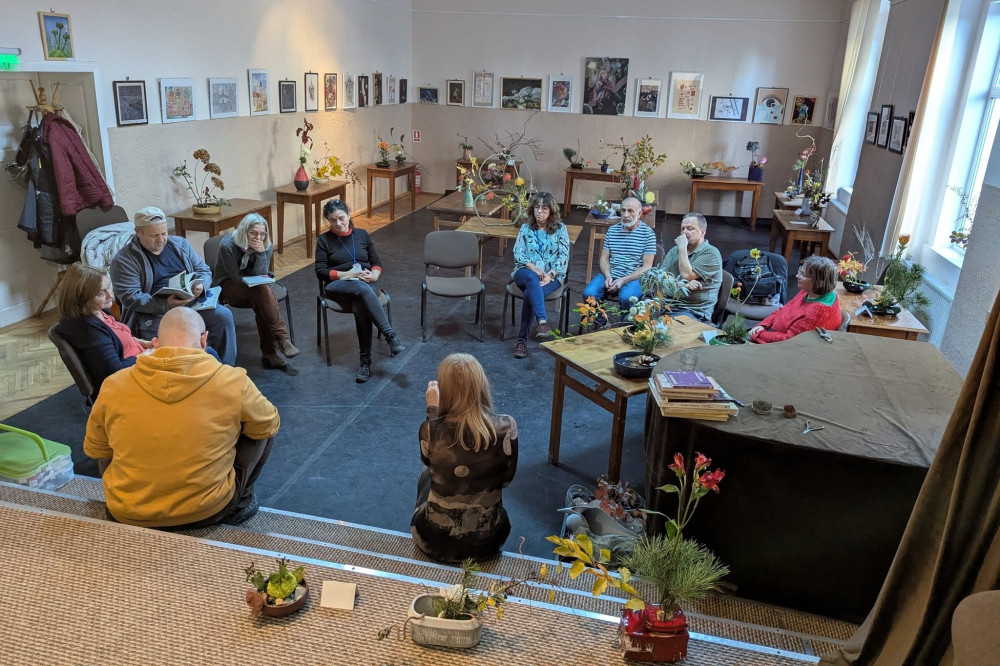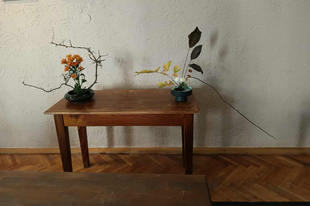 A Kónya Ádám Művelődési Ház udvarán egymástól elkülönített asztalokon dolgoznak, alkotnak azok, akik akár most kezdik, akár már régóta hódolnak a japán virágrendezés művészetének. A fal mellett különböző színű és alakú vázák várják, hogy kézbe vegyék őket, és egy újabb kompozíció befogadóivá válhassanak, az egyik fa alatt pedig érdekes virágok sorakoznak kosarakban, mellettük vékonyabb, hosszabb faágak, akár a termésükkel együtt is. Kosárkákban kisebb és nagyobb kövek, amelyek a vázában a biztonságot szolgálják. Majd megismerkedem egy új szóval: kenzán. Ez egy virágkötészeti nehezék: tüskéibe bele lehet állítani a különböző ágakat, virágokat és azok megtartják, lehetőséget adnak a stabilitásra. Kardhegyet jelent, gyakran ólomalapú, nehéz anyagból áll, ezzel segíti az érdekesebb kompozíciók létrejöttét. Egyéb kellékek is vannak, köztük kisebb-nagyobb metszőollók. Kezdőként én is próbálkozom egy ikebana elkészítésével.
