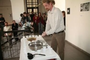 A kiállítást beszéd helyett Péter Alpár a fekete és fehér anyag összemorzsolásának, erőszakos elegyítésének gesztusával nyitotta meg, majd a csoporthoz ezúttal csatlakozó Ütő Gusztáv Munkácsy-díjas képzőművész a kiállításból ihletődve s táncházas múltját felelevenítve, Porhintés címmel performanszt mutatott be. És természetesen, záróakkordként a fekete (nyugat) és fehér (kelet) tea felszolgálása sem maradhatott el.