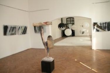 ...plusz a Vargha Mihály Hős II. című szobrát, amely a középső terem egyik központi pontján mintegy a teremtést mutatja fel, összegezve és koncentrálva az erőket, míg az installációk, többnyire elkerülhetetlen leegyszerűsítéssel a halállal, az élettel és a mágiával vannak összefüggésben, a képtár másik felében lévő, egymást kiegészítő, magyarázó és ún. alkalmazott grafikák pedig fekete, fehérben tényleg felfoghatók háromszéki útirajzok illusztrációinak is, kapukat, templomokat, lakóházakat, kastélyokat, udvarházakat, kopjafákat sírköveket mutatnak fel, méghozzá konkrét utalásokkal ellátva, tudni lehet, hogy melyik kopjafa, kapu, templom, lakóház kastély vagy sírkő pontosan hol, melyik faluban lelhető fel. Mindezt fotográfiákkal is lehetne dokumentálni, de azáltal, hogy a művészek a grafika mellett döntöttek, némileg felül is emelkedtek az anyagon és a dokumentáris hűségen, már csak azért is, mert hirtelen élni kezdenek az összefüggéseikből kiragadott részletek, és túlmutatnak önmagukon. S így teremtődik valami bizarr kapcsolat az installációkkal, s grafikákkal. Az egyik teremben Daczó Enikő Antonimiákja látható, egy nagy, fehér szőnyeg, rajta elszórt lábnyomok, talpak lenyomatai, fölötte különféle feliratokkal, ábrákkal, lábnyomokkal, fejekről készült rajzokkal, hajszálakkal telizsúfolt, nagy, fehér gömbök. Mögötte, a másik teremben Péter Alpár fekete-fehér grafikái láthatók, bár időnként vannak színes aranybarnás foltok is, itt valami esztelen küzdelem folyik azért, hogy a foltok, ábrák, jelek kusza, egymásra csúszó tömkelegéből kialakuljon valami, a másik teremben egy nagy installáció, mögötte a falon ég a felirat, amely talán az egész tárlat mottója is lehetne: ,,Az élet és halál csak a tudatban létezik." Fekete kockák sorakoznak mértani rendben, van, amelyiket üveg fed, van, amelyiket nem. A veszélyek igen, amelyek ironikusabb megközelítésben az ejdoszát generálják Kolumbán Hanna az előcsarnok kistermében berendezett installációjának, itt egy padlóra rajzolt, nagy boszorkánykört látunk, körben a grafikák az ördögábrázolás különféle változataival kísérleteznek, az ördögöt mutatják fel különböző alakokban, mely pokolbéli szörnyetegeket, démonokat a valahai mágus élete kockáztatásával ebben a boszorkánykörben idézhetett meg. Van, amikor nő, szarvval a fején, régi, futó előítéletünk elmélyítve…