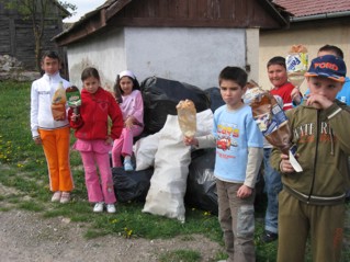 Jól döntött az újfalusi iskola, amikor a Föld napján tanítványai nem megkezdték, hanem folytatták a nem sok, de munka árán szerzett pénzt hozó műanyag palackok és tasakok rendszeres összegyűjtését. Ki ne ismerné itt a Bedő-borvizet? Nos, ott volt a nagyobb gyerekek akciójának dandárja. Villámgyorsan került műanyag zsákokba a nehezen pusztuló szemét, csak arra kellett ügyelni, nehogy az Oltba essen valaki, amikor a folyómeder széléről szedték a fűzfagyökerek között fennakadt palackokat. Egy másik csoport — Ferencz Mária és Bálint Erika vezetésével a faluban gyűjtögette a hasonló hulladékot. A felügyelő tanárok — Szász Annamária és Sala Enikő — elmondták, hogy a palackokat Csíkszentsimonba szállítják, ahol beőrlik. A gyerekek 30 banit kapnak 1 kg palackért. Akkora a lelkesedés, hogy még otthonról is behozzák az iskolába a használhatatlan palackokat. Azt már nem kell székely szemüvegen keresztül látni, hogy a környezetvédelem első rangú katonái éppen a tanulók.