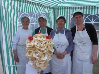 Hiába várja az olvasó a mikóújfalusi rakottág (képünk) receptjét, mert nem tudjuk. A szentgyörgyi vásárban Ilyés Róza, Petki Emma, Dobricza Sára és Gyurka Edit kínálgatta ezt a csörögeféleséget, mely vaníliás cukorporral megszórva isteni, sózva valóságos sörkorcsolya! Székely termékként való levédése folyamatban — mondta a polgármester, aki esküszik rá, hogy helyi ínyencség. Annak idején az üveggyáros gróf más vidékekről telepítette ide munkásait, bizonyára a régi asszonyok hozták magukkal e finomságot! Helyi, igaza van Nyáguly Vilmosnak: mert itt őrizte meg a nép! Vajon a húsvéti regrutalocsoló különlegesen szép népszokást azért nem lehetett látni az idén Újfaluban, mert már nincsen regruta? A tanügyiek már mentik: betanították a gyermekeknek, s a polgármester azt mondta: azon lesznek, hogy ne haljon ki e hagyomány!