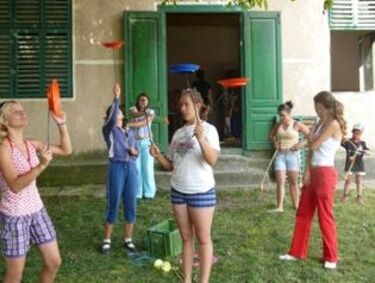 Helybeli, illetve nagyszülőknél nyaraló, összesen negyven 7—14 éves gyerek ismerkedik a zsonglőrözés és akrobatika rejtelmeivel. Bernhard Berger oktató érdeklődésünkre elmondta, a Zirkus Lakritz projekt keretében működnek, idén húszéves a szervezetük, s születésnapi ajándékként — maguknak és az angyalosi gyermekeknek egyaránt — jöttek el a háromszéki faluba. Ők az útiköltséget állták, a szállást és a helyszínt a református egyházközség biztosítja, az étkezésről a gyerekek szülei gondoskodnak. Kérdésünkre, hogyan kerültek épp Angyalosra, a cirkuszista azt válaszolta, egyik tanítványuk, Kőműves Dalma annyi szépet mesélt a faluról, hogy felkeltette kíváncsiságukat, s örvendenek, hogy itt lehetnek. A tíznapos képzés végén, szombaton Illyefalván, vasárnap Angyaloson mutatják be a tanultakat a kis cirkuszisták.
