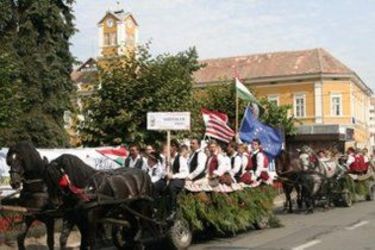 Hatalmas tömeg nem várta ugyan a szekérhadat, ám annak a pár tucat kíváncsinak jókora türelempróbát kellett kiállnia: épp háromnegyed órás késéssel érkeztek meg a szekerek — no de annál nagyobb volt az élmény. Rendőri kísérettel csattogtak a patkók az aszfalton, a bodokiak vezették a sort felzászlózva, aztán a rétyiek népviseletbe bújt, szép lányokkal s nótaszóval, majd az uzoniak az asszonykórussal, s úgyszintén énekelve, a málnásiak hegedűvel kísérték őket, a gidófalviak még az uniós zászlót is magukkal hozták, a zoltániak és a kőröspatakiak bandériumot ültettek a szekérre, a sort záró árkosiak pedig annyi zászlót lobogtattak, hogy a szekéren ülők majdmindenikének jutott egy. Méltán érdemelték ki hát a tapsot mindenütt, ahol elvonultak, s hogy az elismerést meghálálják, az Erzsébet-parkot felülről megkerülve, visszakanyarodtak a Korzóra egy ráadás tapsra.