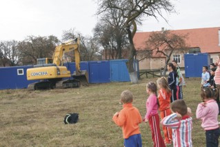 Nem mások ezek, mint a katolnai iskola végzős tanulói. Sajnáljuk, hogy hamarosan el kell hagyni ezt a helyet — mondták —, nagyon szeretjük itt, s minket is szeretnek! De megújuló hely ez: utánunk is újak jönnek! Mutatták, hogy megkezdik a sportcsarnok építését.