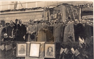 Nagy Viktor, Háromszék kinevezett prefektusa a vonattal érkező politikust fiákeren kísérte a központba, ahol a színház előtt felállított emelvényről köszöntötte a város lakosságát és vette át a megye ajándékát. Az első sorban balról Becsey Pál, a Székely Mikó Kollégium tanára, a Szociáldemokrata Párt megyei elnöke, középen Groza, balján Nagy Viktor, a megye frissen kinevezett prefektusa. (E tisztséget 1950-ig töltötte be úgy, hogy egyben országgyűlési képviselő is volt.) A háttérben a magyar—román, illetve a szovjet—román katonai barátságot jelképező képek láthatók, melyek részben takarják az épület falán levő Nagy Sándor és Veress József vas- és vegyi kereskedésének cégtábláját. A tablókon Sztálin, Mihály király és Groza arcképét fedezzük fel (a király képe fényvisszaverődés miatt nem látszik a felvételen).