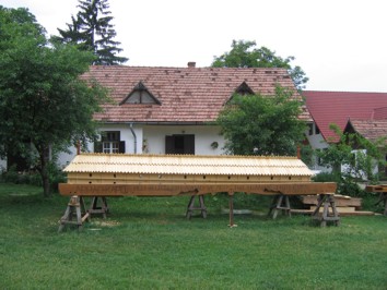 A felső-háromszéki kötött székely kapu dupla galambdúca állványon, a kapu alkatrészei a múzeumudvar pázsitjára állított állványokon várakoznak az utolsó simításokra, hogy a hét méter hosszúságú sapkafa és a testes galambdúc szállítására alkalmas jármű Haszmann József, Lajos és László kíséretében a kunhalmairól, gyógyfürdőiről neves alföldi településre utazzon. Nekünk, háromszékieknek a Hortobágy, Berettyó melléki mezőváros azért is érdekes, hogy a határában szintén fellelhető a Csörsz árka vagy Ördögárok, amelyről a mi Rétyi Nyírünk és az ehhez fűződő mondák nevezetesek. Haszmann József tartogat számomra más meglepetést is. Az udvarról beinvitál a faragóműhelybe, ahol a kapu számomra addig ismeretlen ékessége a különböző tartósító kenceficékre vár. A kaputükörbe egy felnagyított tarsolylemez mintázatát faragták. Az ázsiai ornamentika a kapufelirattal összhangban az Árpád-kort, a honfoglalást megelőző időket is képbe hozza, s a kaputükör másik oldalán található művészi faragású, 1903-as városcímer a 13. század elejéről adatolt település, a magyarság ezerszáz éves történetének folytonosságát érzékelteti.