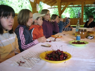 Ez a cseresznyeszüret is a családiasságra csücsöríti a szánkat. Mert itt a gyermekmenü is az. Családias. Zsuzsa mindennap megkérdezi, hogy mi legyen az ebéd. A kívánság rendszerint teljesíthető. A gimnazisták maguk fordítják az étrendet az „anyám főztje", a háziasság és a családiasság felé. Ha a kívánság túl a sablonkoszt, az egyformaság felé fordítaná a menüt, akkor a ház asszonyának mindig van még két-három ajánlata. Aznap, amikor ott voltunk, a kívánságlistára a zsenge szemes bab, azaz zöldfuszulykával összefőzött bableves került. Második fogásnak borjúpörköltet tálaltak apró galuskával. És hagymás uborkasalátával. A cseresznyedesszertről már szóltam.