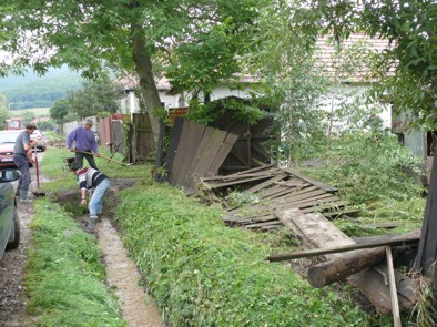 A víz elvitte a faluvégen levő hidat. A máskor szelíd patakon még gumicsizmával sem lehetett átkelni. Dan Coman terepjáróval érkezett, áthajtott: segítséget hozott, kidöntött kerítését igyekeztek felállítani.