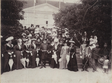 A megyeházhoz vezető feljáró alján 1902. június 11-én készült felvétel elegáns hölgykoszorú közepén örökítette meg a főispánságának 25. évfordulóján rendezett ünnepély alkalmával. (5. kép)