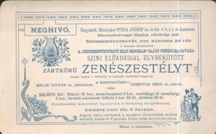 Végül egy, a Potsa védnöksége alatt jótékonysági célokkal rendezett zeneest díszes meghívóját tárjuk az olvasó elé. (6. kép)
