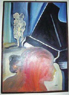 Az esernyő képe (későbbi művön is motívum), a nosztalgikus régmúlt kelléktárának idézése mellett valami változatlan és megállított életképet is sugall. Hasonlóan több képének kelléktárához, a tükör itt nem a szemlélődő tekintetének illuzorikus vissza-tükrözésére törekszik, hanem egy mélységben elvesző, ismeretlen mögöttes világ feltételezését adja. A színek barnává érlelődő tónusai az arany és enyészet kettősségében egy felszín mögött lapuló és lüktető létezés felszivárgásait hordozzák.