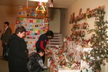 Szalmából, csuhéból készült karácsonyfadíszek, festett dobozok és üvegek, ragasztott képek, gyapjúmanók, magokkal kirakott képeslapok — megannyi apró használati és dísztárgy, ami bármelyik karácsonyi vásárban megtalálható.