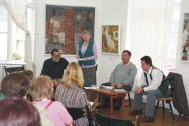 Kozma Mária, a Pallas-Akadémia Kiadó főszerkesztője mutatta be a kiadó új verseskönyveit, a debütáló Ungvári László Zsolt (jobbról) A költő nesztelen ecsetje, Páll Lajos (középen) A csodák palotája és Bogdán László (balról) Szindbád a taligán című kötetét, majd a szerzőkkel beszélgetett, akik verseikből olvastak fel.