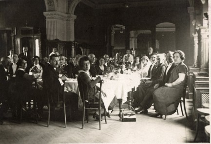 1934 decemberében Mandel J. textilgyári igazgatóságának 25. évfordulóját ünnepelték a kávéház termében. Az eseményről készült felvétel a helyiség berendezéséről árul el részleteket. (4. kép)