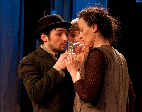 Bőrönd tele ruhákkal, kacatokkal, tejeskanna, egy pad, áttetsző anyagból felhúzott fal mögött vödör, mosdótál. Ebben a térben él a Férfi és a Nő. A játéktér másik felében a Behajtó lakik, dolgozik, kávézik, sakkozik, és azon töpreng, mi a különbség a munkája és az élete között. Semmi. Időnként elmegy a Férfi és a Nő lakásába — a háttérzajokból tudjuk, hogy a hatalmas bérházban még sokan laknak, talán velük is van elszámolnivalója a Behajtónak —, nem ideges, nem kiabál, nem visz el semmit, csupán jelenlétével jelzi, hogy figyel, és bármikor felülkerekedhet. Ez ellenben nem történik meg, beleolvad a környezetbe, eggyé válik a két lakóval, szeretkezik a Nővel, és megveti a Férfit, akit a nincstelenség elemészt, fizikailag részben megsemmisül. Csend és zene váltakozik, Polgár Emília, Nagy Attila és Györgyjakab András pedig olyan belső átéléssel zúdítja a nézőre a különböző hangulatokat, hogy szinte "halljuk", mit közvetítenek egymásnak.