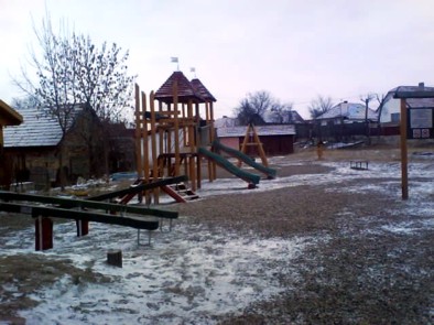 Jól felszerelt, igazi játszótér fogad a kilyéni iskola udvarán. A lassan elköszönő hó arról "árulkodik", hogy használják is. Jó jel ez. Na de lássuk, mi van bent, az épületben.