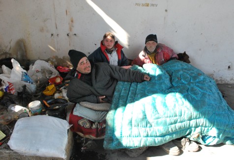 A három otthontalan a Nicolae Colan Általános Iskola és az állami tömbházak közötti kazánházmaradványban lakik, egy sarokba meghúzódva, civilizációhoz szokottak számára elképzelhetetlen körülmények között. Az épületroncs hatalmas, üres csarnok, mindenik ablaka betörve, így a betonhajlék esőtől, széltől, hótól véd, de hidegtől egyáltalán nem, legalább a nap besüt, ha ezt ők vigasznak tekintik. Egyik sarokban ágyféleség, s az elnyűtt kékes paplan alatt három ember, mellettük ételmaradványok, pillepalackok, nejlon, zakota. És egy izgága barna kutya, aki idővel odasimul az idősebb férfi mellé. Ő Majlát Ferenc, hetvenöt éves, lábujjai lefagytak, levágták. Unokája, Erika, korát illetően egyaránt elhangzik a 25 és a 28 év, mindketten bereckiek, az ő férjének mondja magát Apa Lajos, ő harminckilenc éves, szentgyörgyi. Hogy kerültek ide? "Úgy, hogy nincs, ahova mennünk. Nem kaptunk semmi segítséget." Hogy bírják a hideget? "Nincs, amit csináljunk", tüzet raknak rongyokból, papucsokból. Mindhárman katolikusnak vallják magukat, munkahelyük sosem volt, irataik hiányosak. "Kontájneroznak", olykor segítenek a környéken lakók rajtuk, éppen egy férfi hoz nekik vizet, ennivalót: "Ha van valamim, segítek rajtuk". Azt állítják, voltak a csíki negyedi éjjeli szálláson, de a "cigányok reánk szöktek, s megvertek". Napközben "ülögetünk, beszélgetünk, eszegetünk, ha van mit". Éppen valami bőrt kaptak, azt méregetik. Olykor főznek, látszik a tűzrakás nyoma a betonon. Tisztálkodásra nincs lehetőségük. Miben reménykednek? "Építsünk házat valahova" — ábrándozik hangosan Erika. Lajos azt mondja, ő is meg van operálva, "el van vágva a nyakam is", megkéselték a vasazók. "Elegünk van nekünk..."