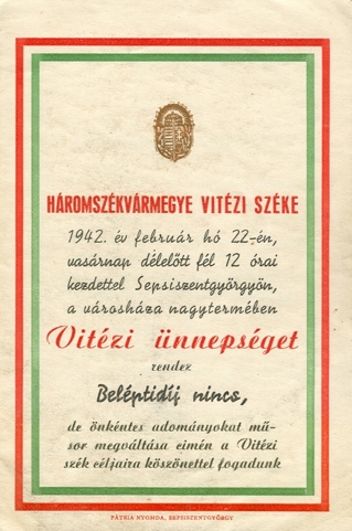 s ezzel a háromszéki vitézek száma százhétre emelkedett. Az ünnepségen Gaáli Ernő, vitéz Rátz Jenő széktartó és vitéz Kocsis László, a dohánygyár aligazgatója mondott beszédet .