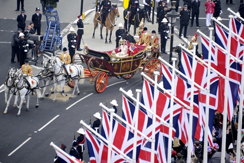 A brit királyi légierő díszelgő átrepüléssel üdvözölte a Buckingham-palota teraszán megjelent fiatal trónörökösi házaspárt. A hét repülőből álló kötelék egyesítette a történelmet és a legújabb kort: először a II. világháború légicsatáiban híressé vált gépek közül tisztelgett egy-egy Spitfire, Hurricane és Lancaster, majd fél perccel később két-két korszerű Tornado és Typhoon követte őket.