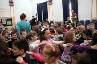 A medve nem játék címmel Kovács Linda és zenésztársai tegnap háromszor mozgatták meg a kicsiket: elindultak hahózva, átdübörögtek egy hídon, keresztülslattyogtak egy mocsáron, felmásztak egy sziklára, bemerészkedtek a barlangba, tapogatóztak a sötétben, és megfutamodtak – majd lassan, óvatosan visszamerészkedtek, útjukból a varjakat elkergették, dalukkal a mackót elaltatták, megkötözték, végül pedig megtáncoltatták, ahogy az egy vásárban illik is. Összesen száznál több gyermek járta el a medvetáncot a megyei könyvtár hirtelen erdővé vált Gábor Áron Termében, hangszeres madárcsicsergés, brummogás, károgás és mókás népdalok kíséretében; és akadt, aki a könyvekre is kíváncsi lett. A zeneileg is igényes, jól felépített műsort szerdán ismét többször előadják.
