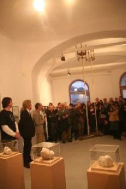 Maga a művész betegsége miatt nem lehetett jelen a kiállításon, de műveinek jó ismerői, Beke László és Sebestyén Ágnes tartottak tárlatvezetést, értelmezve és magyarázva a különös műveket, mintegy bevezetve a nézőt Jovánovics összetéveszthetetlen, enigmatikus világába. Az elsősorban monumentális köztéri alkotásairól ismert művész – itt csak megemlítjük, hogy 5300 négyzetméteres tér- és szoboregyüttese a Rákoskeresztúri köztemető hírhedett 301-es parcelláján állít emléket az 1956-os forradalom mártírjainak – a már említett különös Mennyezetszorító szerkezet és a korai Sejttervek mellett főként fotókkal és a Liza-filmekkel van jelen. A Mennyezetszorító szerkezet három változata is szerepel a katalógusban, a művészé (ez látható a kiállításon) és barátaié, Lakner Lászlóé, Erdély Miklósé és Szentjóby Tamásé. Talán ez utóbbi a legszellemesebb, ugyanis egy Molotov-koktélt szorít a mennyezethez. Aztán beenged a helyiségbe egy macskát, majd egy kutyát. A kutya elől a macska menekül felfelé, s sejthetően leveri a Molotov-koktélt. A történet értelmezi önmagát, és bizarr fénybe állítja az egészet. Ahogyan a kiállítás megnyitóján Beke László elmesélte, utalva egy hatvanas évekbeli szobrára is – ez egy bordó ágyon fekvő figurát ábrázol, és az a címe: Baj –, nyilván, aktualizál, s ez megint csak nem idegen Jovánovics művészetétől.