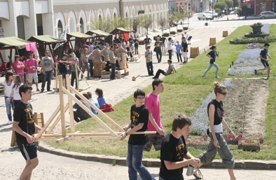 Ezt hét és év közben egyszerűen pihenésnek nevezik, de a diáknapokon minden más, még a focimeccs is: a szombati majálison kosárba, majd hűtőládába kellett rúgni a labdát, és a legkisebb, legtörékenyebb lányok álltak ki szumózni. Természetesen a kötélhúzás, gördeszkázás és minden egyéb is teljesen más szabályok szerint zajlott, az Ember, ne mérgelődj játékot élőben lépték ki, és nem csak az erdőlabirintus bejárásában, hanem alvásban is versenyeztek a 4-es kilométerkőnél. A közel háromszáz fős mezőnyben tíz percig időzött a Csendkirály, vasárnap azonban kalapálásra, fűrészelésre, fúrásra ébredtek a megyeháza közelében lakók: a tudománynak szentelt napon hajítógépet és bonyolult labdapályát kellett építeni szabott feltételek szerint és a megadott anyagok felhasználásával (felvételünk). Mégsem volt két egyforma szerkezet – és mindegyik működött, talán attól, hogy dúdolva dolgoztak rajtuk. Végül egy nagyváros forgalmát kellett megszervezni kicsiben, szakembergárda és karambol nélkül. És bár a tűző nap s a háromnapi hajtás hatása érezhető volt, valahogy nem akaródzott senkinek hazamenni. Hiszen akkor vége, és olyan sok van még a jövő évi diáknapokig...