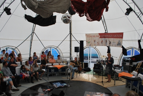 A színházi sátor bejáratánál este lángra lobbantható fáklya várja a sötétedést, odébb a Magyar Teátrum Társaság havilapjának példányai, majd jókora szabadtéri játszóházon áthaladva lehet belépni az igényesen kialakított kulturális térbe. A sátorban körkörös nézőtér, apró színpad, háttérben hangszerek, a pódiumon pedig óriásfotók jelmezekről, s a csilláron is jelmezek lógnak. Szerethető hely, ahogyan egy teátrumhoz illik, büfével. A kezdeményezők, illetve kivitelezők tizenöt munkatárssal, két napig, kétszer húsz órában építették ki ezt a két teherautónyi fény- és hangtechnikával felszerelt teret. Mint csiga a házát, mondják, önkéntes munkával. Így aztán érthető, hogy "ékszerdobozként" ajánlják e találkozóhelyet: ilyent Tusványoson még nem láttak. És invitációjuk nem csak művészeknek, sajtómunkásoknak szól, bizonyos, hogy a Tusványos alakulását ismerők számára újdonság e nyári, pár napos színházi tér, ahol szakmai vitákat, előadásokat – délelőttönként bábjátékot is! –, élőzenés produkciókat lehet látni. "Innen nyílik a legjobb látvány a nagyszínpadra, itt forognak a legjobb pasik/csajok, itt fogunk a legjobbat vitatkozni, beszélgetni, aztán bulizni" – írja meghívójában a színházi sátor kitalálója, Fekete Péter, a Békés Megyei Jókai Színház igazgatója. Aztán a békéscsabai társulat vezetője érdeklődésünkre még elmondja, "a tusványosi szabadegyetem kulturális fesztivál, nagyon sok fesztivál van a világon, Európában, Magyarországon, ezek általában bulihelyek; az itteni az, ahol még mindig az értelmiség vitája, eszmecseréje, együttgondolkodása a mérvadó, ezért azt gondoltuk, a színházművészet sem maradhat ki ebből a hullámból".