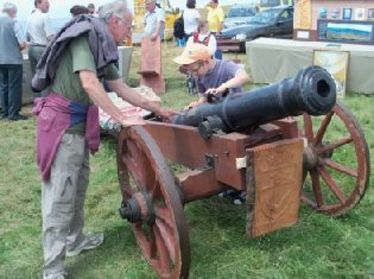 Nagyapa és unokája a Berecki Gábor Áron Alapítvány ágyúja fölött tart szemlét az Óriáspince-tető kézműves- kiállításán.