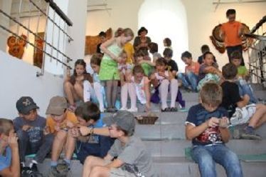 Szokatlan látvány egy képtárban, hogy gyermekek ülnek kis párnákon a lépcsőn, és fonalakat tekergetnek, tanulják az ujjhorgolást.