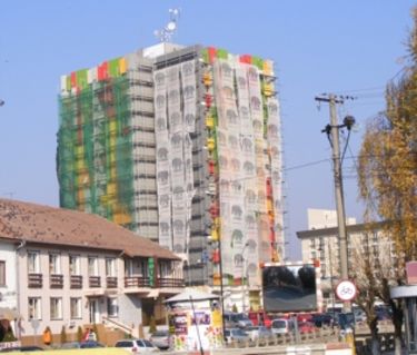 Még dolgoznak a mesteremberek a Szarvas Szálló külső szigetelésén, de a védőhálók alól már kikacsint az ingatlan új arca. A tervező vidám színeket szánt az épületre. Az eddig látható részletek szerint a választás jól sikerült, a sárga, almazöld, narancssárga összhangot alkot, és minden bizonnyal érdekes foltjává válik majd Kovászna központjának.