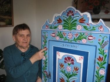 A háromszéki székely festett bútor hagyományos virágelemeivel díszített saroktékát készített Fábián Gizella sepsiszentgyörgyi nyugalmazott óvónő a város jeles évfordulója emlékére. Felirata: 550 éve város Sepsiszentgyörgy – Fábián Gizella – 2011.