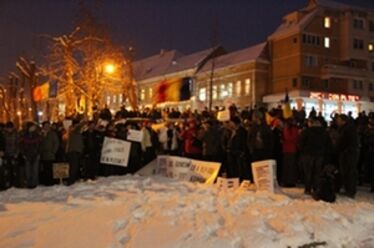 Több mint háromszázan gyűltek össze tegnap délután öt órakor a prefektúra előtt, a hangerővel azonban többezres tömeg sem vallott volna szégyent, sípokkal, no meg a teli torokból érkező jelszavakkal sikerült felforrósítani a hideg januári kora estét. Több nemzetiség, többféle társadalmi kategória és korosztály képviseltette magát, a leggyakrabban visszatérő közös jelszavak – Le Băsescuval! és Tolvajok, tolvajok! – eltörölték a különbségeket.