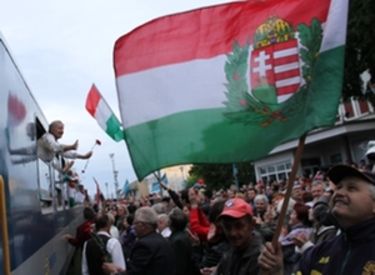 Ötezres ünneplő tömeg nemzeti lobogókkal, Árpád-sávos és székely zászlókkal várta tegnap este a sepsiszentgyörgyi vasútállomáson az Aranycsapat mozdony húzta Csíksomlyó expresszt. Karon ülve, babakocsiban, anya-apa nyakában gyerekek, sok-sok fiatal és idősebbek tapssal, integetve fogadták a kissé késve érkező szerelvényt, miközben rezesbanda húzta az indulókat. Többen virágot, ajándéktárgyakat, gondosan becsomagolt kürtőskalácsot, nemzetiszín szalaggal átkötött üvegben pálinkát is hoztak az anyaországi zarándokoknak.