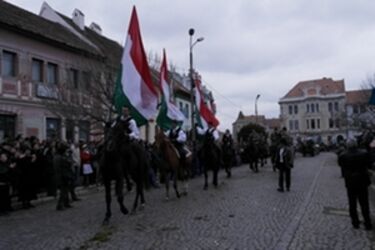 Lóháton érkezett tegnap délelőtt Semjén Zsolt, Magyarország miniszterelnök-helyettese az 1848–49-es magyar forradalom és szabadságharc 165. évfordulóját ünneplő felső-háromszékiek közé a Gábor Áron térre (képünk). A magyar kormányfő-helyettes Tamás Sándorral, Kovászna Megye Tanácsának elnökével, Olosz Gergely szenátorral és Fejér László Ödön képviselővel együtt a főtéren felvonuló huszár hagyományőrzőkhöz csatlakozott. Ez az első alkalom, amikor politikusok lóháton vonulnak.