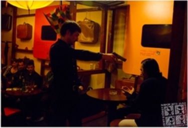 Érthető, ugye, miért választotta a híres írót alakító és az előadást is rendező Sebastian Marina ezt a Pinter-darabot. Ráadásul tökéletesen eljátszható adott esetben kocsmában is, minimális kelléktárral, kettesben választott társával, Veres-Nagy Attilával. És ők meg is teszik, hol kisebb völgyekkel, hol nagyobb hullámokkal alakítva figuráikat (Sebastian Marina egyenletes teljesítményét csak részben magyarázza nagyobb tapasztalata), a teret okosan kihasználva, hogy a kocsmába betévedt nézővel valóban elhitetik: hú, ez tényleg színház. Csak némi kis javítanivaló lenne még: most már világos, javaslatom, hogy egyikük magyarul, másikuk románul beszélve játssza végig szerepét, nem működhet, de azért a hasznos utasításokat lejátszó képernyőkön a kétnyelvű felirat beleférne. A darabbeli fiatal szerető idegen nációjának kiderültekor pedig erőltetett a „magyarosan hangzó” észrevétel, semmi szükség az ilyképp való helyszínhez igazításra. Ün reszt: tot ünáinte!
