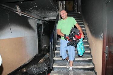 Belépni csak az ott élőknek és hozzátartozóiknak, illetve a szakembereknek szabad. A látvány kísérteties: a fekete falakon kifolyt üvegű gázórák, megpörkölődött vezetékek lógnak, a lépcsőházi korlát műanyag borítása – ezen futott fel a láng – nagyrészt eltűnt, ahol megmaradt, ott hólyagosra dagadt. A földszinten a lépcső alatti kacatgyűjteményből drótháló, ágysodrony, néhány fazék, égett rongydarab és nehezen azonosítható tárgy maradt, a hatóságok ebből próbálják kideríteni, hogy volt-e házilag tákolt világítása a dróthálóval és préselt lemezzel elkülönített raktárnak. Az első emeleten egy sarkaiból kiemelt, átlyukadt ajtó, kerete is teljesen elszenesedett. A szomszédos vasajtó a helyén áll, de csak elszíneződött, görbült lemez már, becsukni sem lehet. A korláthoz kötött bicikli is menthetetlennek látszik, de senki sem siránkozik: aki tud, takarít, mások egymással beszélgetnek.