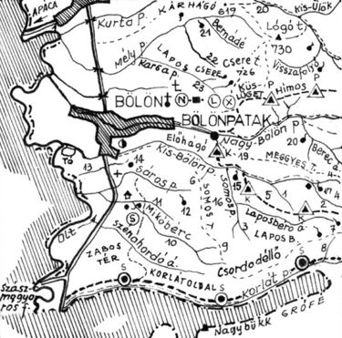 A számokkal és betűkkel jelölt helynevek és objektumok: Bornás-bérc árka (1), Gurdon árka (2), Ilkottszeg árka (3), Gurdon (4), Kis bérc és Bornás bérc (5), Lüget (6), Kicsikút (7), Hajdin-árok (8), Nagyút (9), Mikó-bérc árka (10), Gerőfőd-árka (11), Nagy Buggyon (12), Sinkorotvány-árka (13), Kotlósvíz – kénes forrás (14), Máté-kút (15), Erősódal (16), Gurdon-kúttya (17), Puliszkáskút (18), Kisárnyék (19), Lógó árnyéka (20), Vajdáné-kúttya (21), Mélyárok (22) és Csenger árka (23).