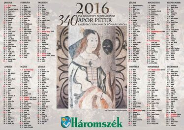 Ahogy történt 2015-ben, amikor a háromszéki önvédelmi harc egyik személyiségének, Berde Mózsának állítottunk emléket, s ez a gondolat 2016-ra egy új köztéri szobrot is „szül” Sepsiszentgyörgyön. Mostani ajándékunk „megszemélyesítője” a 340 éve született emlékíró, Háromszék egykori főkirálybírója, altorjai báró Apor Péter, aki nem csupán Metamorphosis Transylvaniae című munkájával, hanem közéleti szerepvállalásával is beírta nevét történelmünkbe. Hiteles arcképe nem maradt ránk, így illusztrációként a torjai Apor-kastély freskóit használtuk fel (fotó: Henning János, grafikus: Ferencz Anikó). A falinaptárt az elkövetkező napokban minden előfizetőnknek házhoz szállítjuk, megvásárolható lapárusító bódéinkban is.