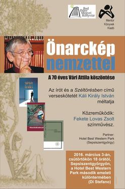 A sepsiszentgyörgyi Bod Péter Megyei Könyvtár és a marosvásárhelyi Mentor Könyvek Kiadó szervezésében ma 18 órától az eseményben partnerséget vállaló Hotel Best Western Park második emeleti különtermében (Di Stefano) Önarckép nemzettel címmel köszöntik születésnapján a hetvenéves Vári Attila írót, költőt. A rendezvényen a szerzőt és Széltörésben című, frissen megjelent verseskötetét Káli Király István, a kiadó vezetője méltatja. Közreműködik: Fekete Lovas Zsolt.