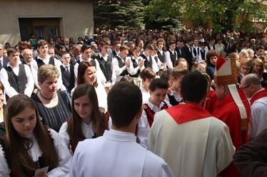 A két hatalmas diófa árnyékába húzódva, egyheti eső után napsütéses időben zajlott vasárnap délelőtt a sepsiszentgyörgyi Szent József-plébánia tágas udvarán a megyeszékhely négy katolikus egyházközségének közös bérmálkozási ünnepsége, amelyet Jakubinyi György Miklós, a Gyulafehérvári Főegyházmegye érseke szolgáltatott ki 114 népviseletbe öltözött fiatalnak.