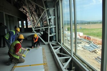 A telepen gőzerővel (mifelénk szokatlanul gyors ritmusban) zajlik a munka – jelenleg körülbelül hetvenen dolgoznak, de volt időszak, amikor a munkások száma elérte a kétszázat –, a haladás látványos, az ütemtervet tartják, novemberre elkészül az ország egyik legkorszerűbbnek szánt sportcsarnoka. A rézlemezekkel, üveglapokkal is burkolt sárga épületben jelenleg főként a belső tér rendezése zajlik, az eredményjelzők, a lámpák a helyükre kerültek, egy sor berendezés, felszerelés megérkezett, közben a parkoló kialakításán is dolgoznak.