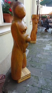 A Tanár Úr nagy játékos is. A mintázás hozzáadó gesztusa helyett most a faragás elvevő erejével teremt jelrendszert. Faszobrai a nővé válás büszke küldetését, a termékenység áldott állapotát, a szülés teremtő erejét, az anyaság misztériumát és a szimbiózis végtelenségét keltik életre. Az alakváltozatok itt az elrendezés révén a kiteljesedés felé haladó átváltozást is mutatják. Az érintetlen kamasztest felidézésétől haladunk az ősi mítoszokból is ismert földanya képzetéig. Brâncuşi mondja, „addig nézd a szobrokat, míg látni nem kezded őket.” Vetró András faszobrai torzó jellegük ellenére is a női testtel jelképezett teljesség utáni vágyat képezik le. A nőiesség alakjai a fa íveivel és annak organikus szerkezetével, a természet alkotta véletlenszerűségével gyöngédséget és szépséget sugallnak. Szintén Brâncuşi-t idézem, „minden anyagnak megvan a maga egyéni sajátossága, amelyet mi nem tudunk saját kedvünk szerint megsemmisíteni, csak saját nyelvén megszólaltatni.” A fa organikus struktúrájának megőrzése által véletlenszerű és mégis egyetemes absztraháló figurák jönnek létre, amelyek sajátos karaktervonásokkal rendelkeznek. Így a fa természetes adottságának tiszteletben tartásával a művész mégis saját elképzelését tudja feltárni. Itt az arctalanság nem elvesz, hanem hozzáad. A modern egyedi lény helyett az ősi kollektív jelleg dominál. A szobrok tömbszerű formái szilárd és érzéki egységet teremtenek. A formák egységes rendszerbe szerveződtek, ahol eredetiség, ösztön, vitalitás, fiatalság és a teremtő erő vágya hangsúlyozódik. A domború formák már nem viselik magukon a véső nyomait. A lecsiszolt felületek így tömbszerűségük ellenére is finomságot, lágyságot és eleganciát érzékeltetnek. Ritkán a meghagyott és hangsúlyozott vésőnyomok kiemelő szerepet kapnak. A jelképek gyakran az agyagmintázás negatív és pozitív forma mintázásával nyomatékosító jelentőségűek a faszobron is. Ennek eredményeként a bemélyedések és kiemelkedések a női test hangsúlyozott pontjain jelennek meg. A térplasztikák expresszionista lendülete, a mozgásban megragadt cselekvő ember helyett itt a leegyszerűsített kubista formák, a motívumok ismétlődő ritmusának líraiságáé a vezető szerep. A megmunkált fa erezete, olajjal vagy földfestékkel lekezelt felszínei meleg árnyalatokat, az élő természet egyszeri és megismételhetetlen élményét hordozzák.