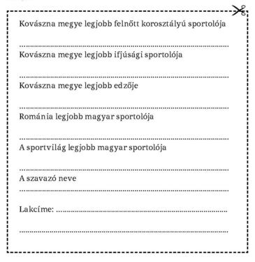 Tanulva az előző évek tapasztalataiból, idén mindenki csak egyszer szavazhat a lapból kivágott szelvénnyel (amelyet Sepsiszentgyörgyön a Mihai Viteazul tér 2. szám alatti címre kell eljuttatni), de tippjeiket, javaslataikat e-mailben (tibodi@3szek.ro, miska@3szek.ro) is beküldhetik. Csak azokat a szelvényeket és elektronikus leveleket fogadjuk el, amelyeket pontosan kitöltenek, minden kérdésre felelnek, és megadják teljes nevüket, pontos címüket.